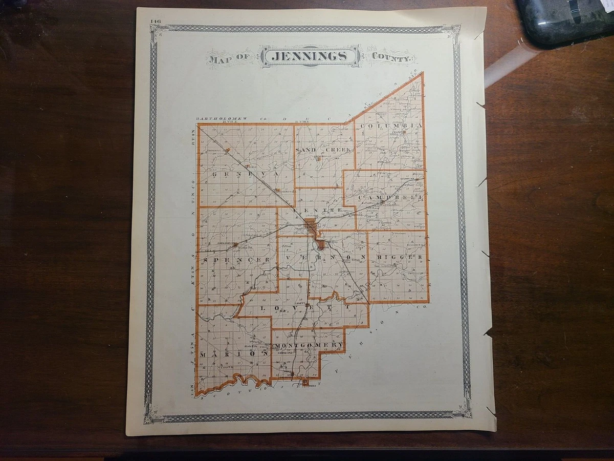 JENNINGS COUNTY & PERU ANTIQUE original 1876 Plat Map INDIANA